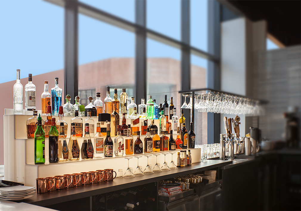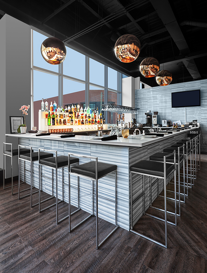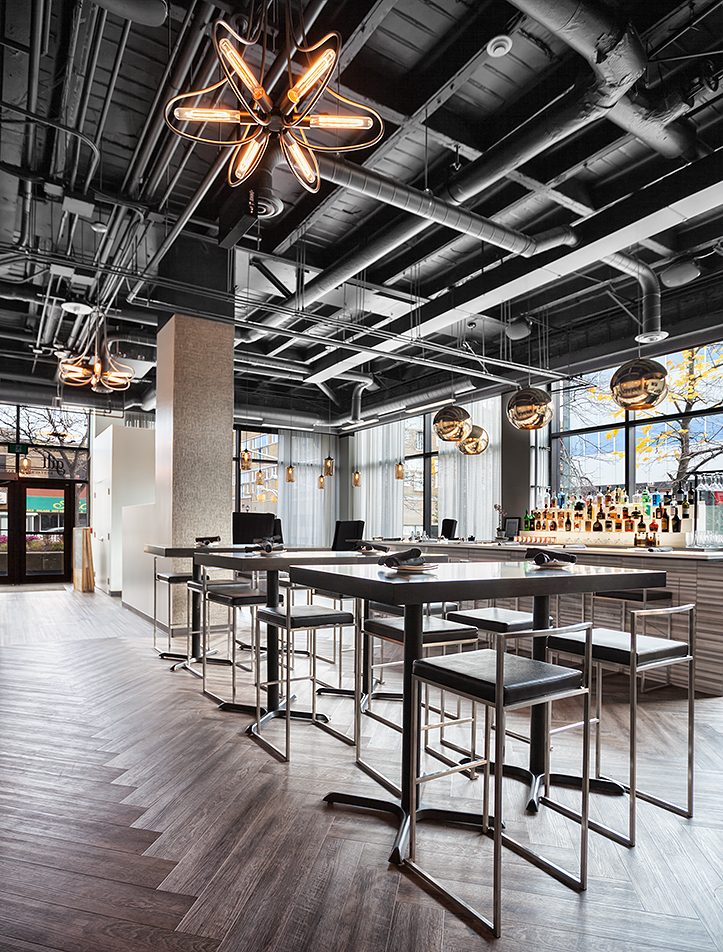 A collection of sleek and textured materials were combined to convey elegance without losing sight of location – a downtown in flux. A full commercial kitchen was space planned and partially exposed to the dining room – with low lighting and neutral palette.